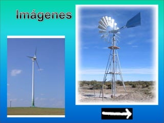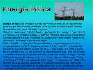 Este documento describe la energía eólica, una fuente de energía renovable que se obtiene del movimiento del viento. Históricamente, la energía eólica se ha utilizado para impulsar barcos y molinos de viento. Actualmente, se usa principalmente para generar electricidad mediante aerogeneradores. España ha experimentado un fuerte crecimiento en la energía eólica, produciendo hasta el 13.8% de su electricidad a través de esta fuente en 2009.