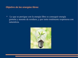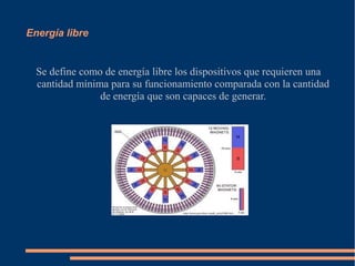 Este documento describe varios tipos de energía libre, incluyendo dispositivos que requieren una mínima cantidad de energía para funcionar y generar más energía, el objetivo de conseguir energía gratuita y sin residuos, y los inventos de Nikola Tesla sobre generación de energía perpetua. También menciona formas de energía como la radiante, motores de imanes permanentes, electrólisis super eficiente y la combustión de agua salada.