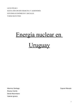 El documento provee una breve reseña histórica de la energía nuclear, desde su desarrollo para usos bélicos durante la Segunda Guerra Mundial hasta su consideración para generación eléctrica en Uruguay a fines de los 1980s y principios de los 1990s. Explica cómo Uruguay fue beneficiado con fondos de la OIEA para incentivar el uso pacífico de la tecnología nuclear y cómo se planteó construir una central nuclear en Paso de los Toros, aunque el proyecto fue archivado en 1992 ante las protestas ecologistas.