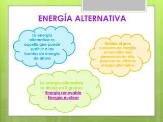 El documento describe las diferentes formas de energía alternativa, incluyendo energía renovable como la hidráulica, solar, eólica, geotérmica y mareomotriz. Explica que la energía hidráulica se obtiene de embalses, la solar de paneles solares, la eólica de aerogeneradores, la geotérmica del calor interno de la Tierra, y la mareomotriz de las mareas. También cubre la energía nuclear, que se libera a través de reacciones nucleares, y la biomasa