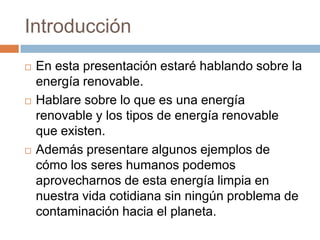Este documento trata sobre la energía renovable. Explica que la energía renovable proviene de fuentes como la solar, eólica e hidráulica que son potencialmente inagotables. Describe los tipos principales de energía renovable y provee ejemplos de cómo se usan. También discute los beneficios de usar energía renovable como una forma de reducir la contaminación y mejorar la economía.
