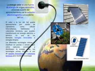 La energía solar es una fuente de energía renovable obtenida a partir de la radiación electromagnética del Sol. El calor y la luz solar pueden aprovecharse mediante captadores como células fotovoltaicas o colectores térmicos, que transforman la energía solar en eléctrica o térmica. Las tecnologías solares se clasifican en pasivas o activas según cómo capturan, convierten y distribuyen la energía solar.