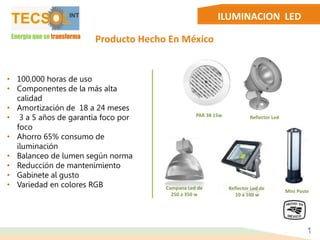 Este documento ofrece una variedad de soluciones de ahorro de energía como iluminación LED, sistemas fotovoltaicos, aire acondicionado, calentamiento de agua, generación eólica y más. También describe productos importados, certificaciones, clientes y asesoría para tramites de ahorro fiscal y CFE. La compañía provee soluciones llave en mano para proyectos de eficiencia energética.