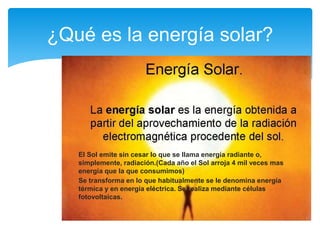 La energía solar es una fuente renovable y no contaminante que se puede transformar en energía térmica y eléctrica, siendo especialmente útil en zonas rurales y montañosas. A pesar de sus ventajas, como el bajo costo de mantenimiento y la reducción de dependencia energética, enfrenta retos como la ocupación de grandes extensiones de suelo y la competencia con otras formas de energía. En México, el desarrollo de instalaciones solares está en aumento, destacando proyectos significativos que ofrecen independencia energética y beneficios ambientales.