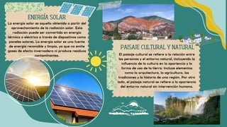 La energía solar es una fuente de energía renovable y limpia que no emite gases de efecto invernadero. El documento también discute el paisaje cultural y natural, las incidencias en el diseño de viviendas como el clima y las necesidades de los residentes, y los principios de la arquitectura sostenible como la eficiencia energética y el uso de materiales sustentables.