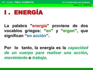 El documento define la energía como la capacidad de un cuerpo para realizar una acción o movimiento. Explica que la energía se manifiesta de diversas formas como la energía mecánica, térmica, eléctrica, radiante, nuclear, química y acústica. Además, detalla las unidades de medida de la energía y algunos ejemplos de cada tipo de energía.