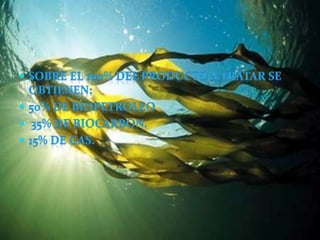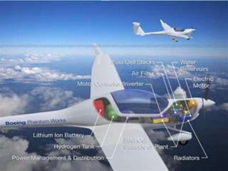 El documento describe diferentes fuentes de energía alternativas como una opción ante el agotamiento de los combustibles fósiles. Menciona energías como la eólica, solar, geotérmica e hidroeléctrica. También describe el biopetróleo producido a partir de algas como un combustible ecológico más barato que el petróleo. Finalmente, presenta un avión impulsado por una pila de hidrógeno y paneles solares como una alternativa sin combustibles fósiles.