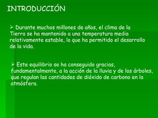 El documento describe cómo el uso de combustibles fósiles y la destrucción de bosques han provocado el cambio climático, llevando a acuerdos como el Protocolo de Kyoto para reducir las emisiones. Señala que las energías renovables como la solar, eólica e hidráulica son alternativas sostenibles a los combustibles fósiles porque son renovables, no contaminan y promueven el desarrollo local.