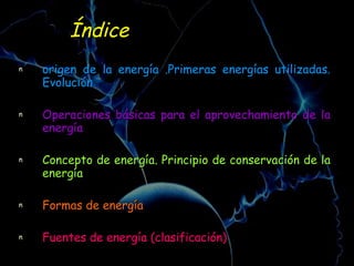 El documento habla sobre los orígenes y evolución del uso de la energía por el ser humano, las operaciones básicas para aprovecharla, las diferentes formas que puede tomar y las fuentes de donde se obtiene. Explica que el ser humano primero usaba su propia fuerza y la de animales, y luego molinos de agua y viento. Describe los procesos de producción, transformación y transporte/distribución de la energía primaria a los usuarios. Define energía y explica el principio de conservación. Enumera formas como química