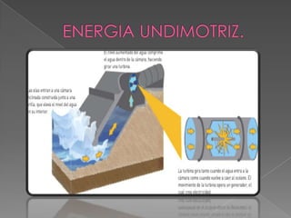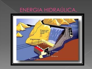 La energía eólica se obtiene del viento y se utiliza principalmente para producir energía eléctrica mediante aerogeneradores. La energía geotérmica se extrae del calor del interior de la Tierra y se usa para calefacción, agua caliente y producción de electricidad. La energía hidráulica se genera al dejar caer agua retenida a gran altura para mover turbinas e hidroeléctricas.