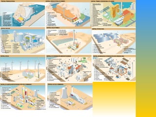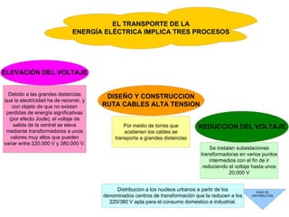 El documento aborda los conceptos fundamentales de la generación, transporte y almacenamiento de energía eléctrica, destacando el papel de turbinas y alternadores en la conversión de energía mecánica en energía eléctrica. Describe diferentes tipos de centrales eléctricas y la importancia de elevar tensiones para reducir pérdidas durante el transporte. También se discuten métodos de almacenamiento de energía, incluyendo baterías y pilas de combustible, señalando sus ventajas y desventajas.