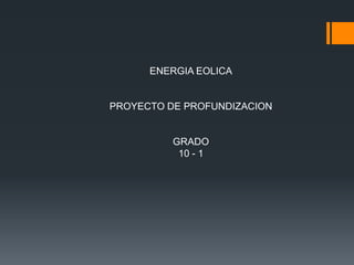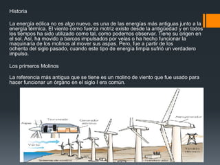 El documento trata sobre la energía eólica. Explica que la energía eólica se obtiene del movimiento del viento y ha sido utilizada desde la antigüedad para impulsar barcos y molinos. Hoy en día se usa principalmente para generar energía eléctrica mediante aerogeneradores. Las ventajas son que es renovable, limpia y crea puestos de trabajo.