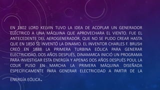 La energía eólica es una de las formas de energía más antiguas utilizadas por la humanidad, con los primeros usos documentados en barcos egipcios hace unos 3,000 años. Aunque los primeros molinos de viento datan del siglo VII en Afganistán, no fue hasta el siglo XIX cuando se desarrollaron los primeros aerogeneradores para generar electricidad, impulsando el uso moderno de la energía eólica como una fuente renovable y no contaminante.