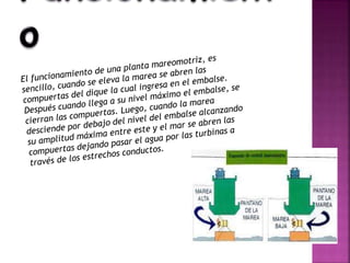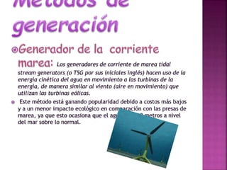 La energía mareomotriz se genera aprovechando las mareas, utilizando presas y turbinas que funcionan tanto en mareas altas como bajas. Este tipo de energía es renovable, no contaminante y accesible en cualquier época del año, aunque presenta desventajas como el impacto visual y dependencias de la amplitud de las mareas. La tecnología de la energía mareomotriz dinámica propone una generación teórica basada en las interacciones de energías cinética y potencial en corrientes de marea.