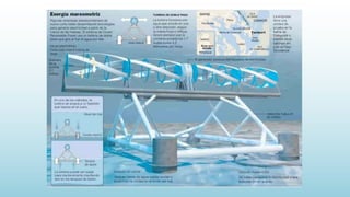 Este documento describe tres formas de aprovechar la energía del mar: la energía mareotermica, que usa la diferencia de temperatura entre aguas superficiales y profundas; la energía mareomotriz, que aprovecha la amplitud de las mareas; y la energía undimotriz, que usa la energía de las olas producidas por el viento. Incluye esquemas de generadores mareotermicos y mareomotriz y explica que las mareas se originan por las fuerzas gravitacionales de la Luna, Tierra y Sol, mientras que