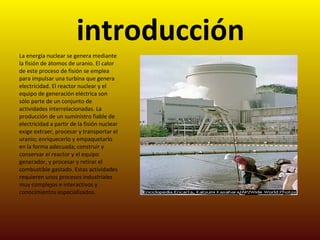 El documento proporciona información sobre la energía nuclear, incluyendo cómo funcionan las centrales nucleares, los tipos de energía nuclear (fisión y fusión), las ventajas y desventajas de la energía nuclear, los peligros asociados con la radiación, y los usos militares como las bombas atómicas.