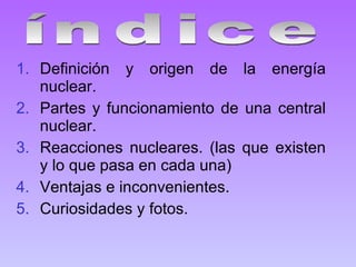 Este documento resume la energía nuclear, incluyendo su definición y origen, las partes y funcionamiento de una central nuclear, los tipos de reacciones nucleares como la fisión y la fusión, las ventajas e inconvenientes de la energía nuclear, y algunas curiosidades sobre la energía nuclear.
