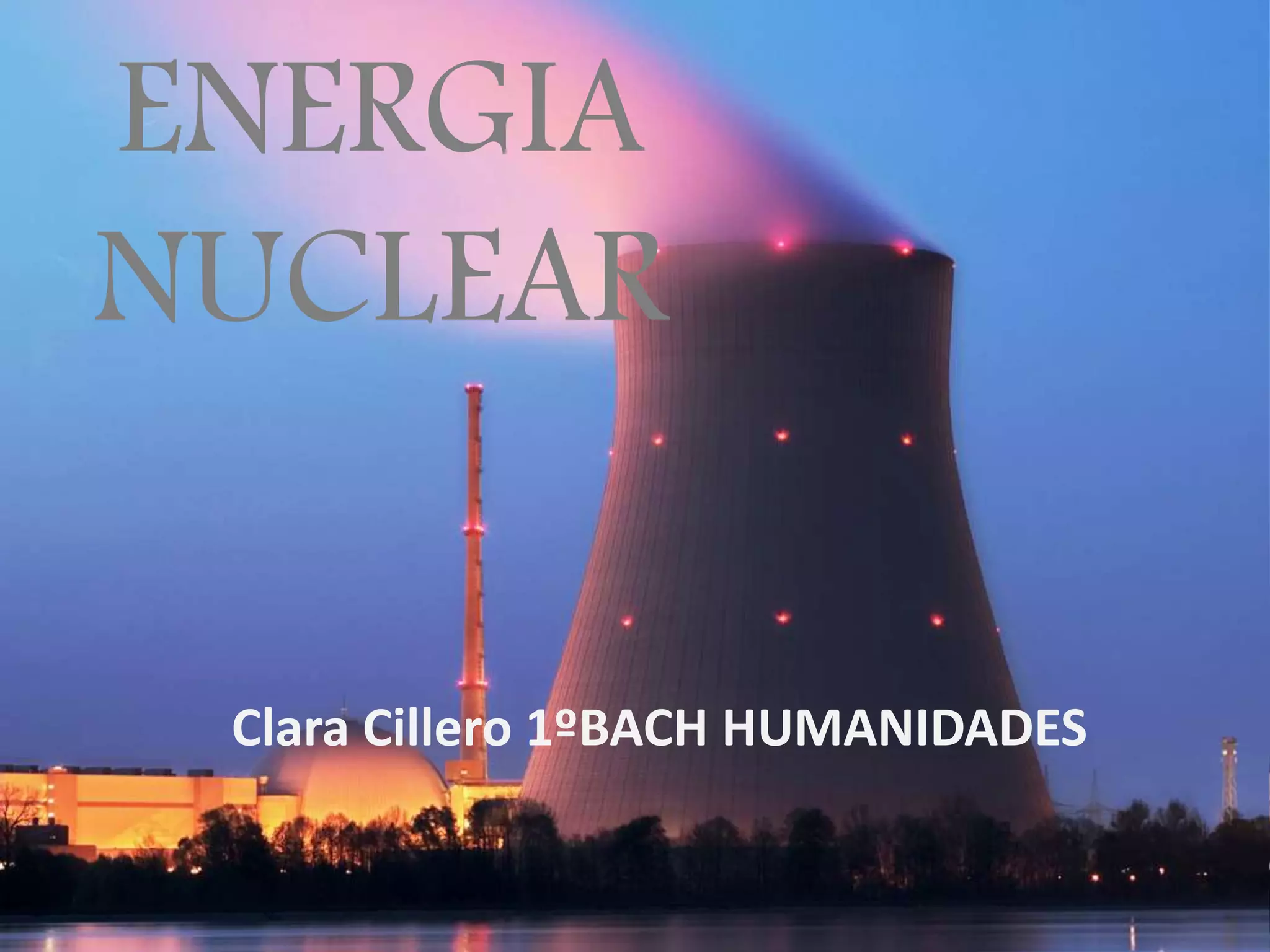La energía nuclear es la energía que mantiene unidos neutrones y protones y puede utilizarse para producir electricidad en centrales nucleares mediante reactores nucleares que generan una reacción nuclear controlada. Aunque es una energía limpia, constante y barata, también plantea riesgos como la emisión de residuos radiactivos y los posibles accidentes en centrales nucleares si no están debidamente controladas.