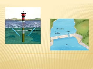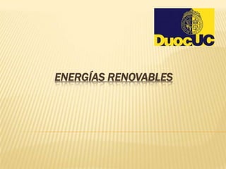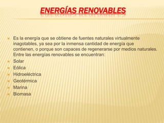 Este documento describe las principales fuentes de energía renovables, incluyendo la energía solar, eólica, hidráulica, geotérmica, marina y biomasa. Cada una se obtiene de recursos naturales y procesos que se regeneran constantemente, como la luz solar, el viento, los ríos, el calor interno de la Tierra, los océanos y los desechos orgánicos. La energía renovable ofrece una alternativa sostenible a los combustibles fósiles agotables.