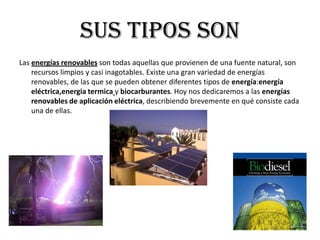 Este documento describe los diferentes tipos de energía renovable, incluyendo la energía eólica, geotérmica, hidroeléctrica, maremotriz, solar, undimotriz y biomasa. Explica que las energías renovables provienen de fuentes naturales virtualmente inagotables y son recursos limpios. Luego detalla tres tipos principales de energía renovable: energía eléctrica, energía térmica y biocarburantes.