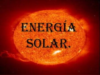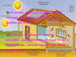 La energía solar se obtiene mediante la captación de la luz y el calor del sol y es una energía renovable y limpia. La Tierra recibe una gran cantidad de radiación solar cada año, equivalente al doble de toda la energía producida por fuentes como el petróleo, el carbón y el gas natural. Los paneles solares fotovoltaicos convierten la luz solar en energía eléctrica aunque su rendimiento y precio aún deben mejorar, pero son útiles para usos domésticos como calentar agua y cocinar.