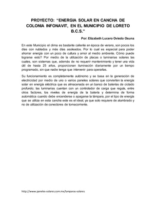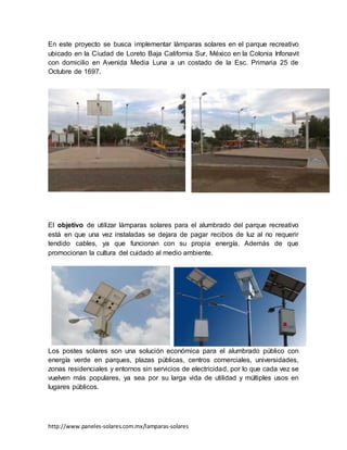 El documento propone instalar lámparas solares en un parque recreativo en Loreto, Baja California Sur, México para ahorrar en el pago de recibos de luz. Las lámparas solares funcionan de manera autónoma usando paneles solares para generar electricidad y almacenarla en baterías, lo que evitaría tendidos eléctricos. Esto promovería el cuidado del medio ambiente y ahorraría fondos públicos.