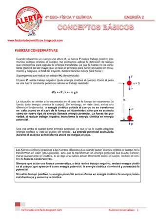 El documento explica las fuerzas conservativas y cómo transfieren energía entre energía cinética y potencial. Específicamente, 1) las fuerzas conservativas como la gravedad transfieren energía cinética a potencial durante el ascenso de un objeto y transfieren energía potencial a cinética durante el descenso, manteniendo la suma total de energía constante; y 2) el trabajo realizado por una fuerza conservativa puede calcularse como el cambio en la energía potencial del objeto.