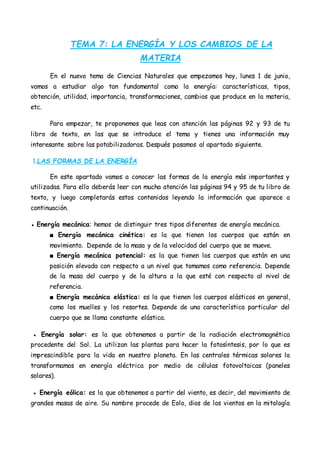 El documento presenta información sobre el tema 7 de energía y cambios de la materia. Se introducen las diferentes formas de energía como energía mecánica, solar, eólica, geotérmica, mareomotriz e hidráulica. También se describen los efectos del calor sobre la materia y los estados de la materia, así como los tipos de materias como sustancias y mezclas y los procedimientos para la separación de mezclas. Finalmente, se explican ejemplos de reacciones químicas a través de experimentos.