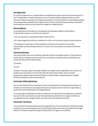 Este documento resume los diferentes tipos de centrales de generación de energía eléctrica, incluyendo centrales hidroeléctricas, térmicas, nucleares, solares y eólicas. Explica que las centrales hidroeléctricas convierten la energía potencial del agua en energía cinética para mover los generadores, mientras que las centrales térmicas usan el vapor generado por la combustión de carbón u otros combustibles. Las centrales nucleares usan la energía térmica de las reacciones de fisión nuclear, y las central