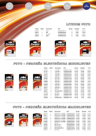 Este documento presenta una lista de productos de pilas y linternas de la marca Energizer. Incluye códigos de producto, descripciones, especificaciones de empaque, precios de venta al público y representaciones. También destaca algunos hitos y avances tecnológicos clave de Energizer como pilas de litio de mayor duración y pilas alcalinas con mayor retención de carga.