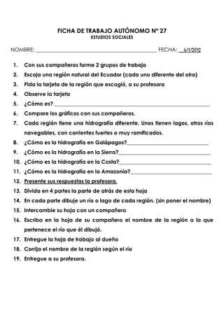 Estas fichas de trabajo guían a los estudiantes a través de varias actividades prácticas relacionadas con el mapa físico y político de Ecuador, incluyendo identificar colores en el mapa, regiones naturales, hidrografía, erosión del suelo y formas de cultivo. Los estudiantes completan ejercicios individuales y en grupo que involucran observar, comparar, dibujar y presentar respuestas.