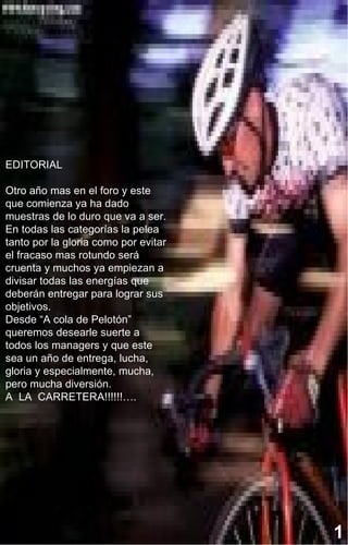 El documento resume las principales carreras del mes de enero. Destaca la victoria de Thomas Dekker en el Tour de San Luis, imponiéndose en la general y una etapa, y la victoria de Marco Pinotti en el campeonato de Italia de contrarreloj. También nombra a los corredores y managers del mes según su rendimiento.