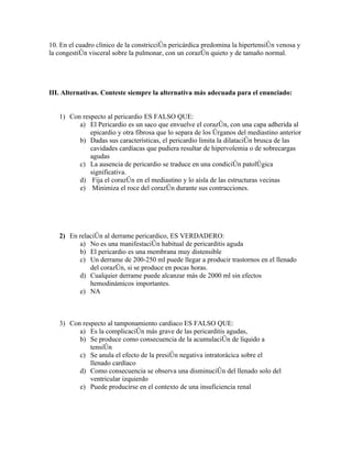 Este documento presenta información sobre diferentes enfermedades del pericardio como la pericarditis aguda, el tamponamiento cardíaco, la pericarditis constrictiva y el pulso paradójico. Incluye definiciones de estos términos médicos, preguntas de verdadero o falso sobre sus características, y preguntas de selección múltiple para evaluar el conocimiento sobre los síntomas, signos y manifestaciones clínicas de estas afecciones del pericardio.