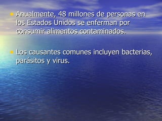 Anualmente, 48 millones de personas en los Estados Unidos se enferman por consumir alimentos contaminados con bacterias, parásitos y virus, lo que causa síntomas que van desde leves como malestar estomacal y cólicos abdominales hasta más severos como diarrea, fiebre y deshidratación. La manipulación incorrecta de los alimentos es la causa más común de estas enfermedades transmitidas por alimentos.