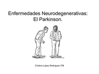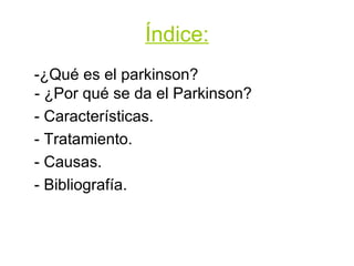 El documento describe la enfermedad de Parkinson, una enfermedad neurodegenerativa que causa la pérdida de neuronas en la sustancia negra del cerebro y se manifiesta con temblores, rigidez muscular, lentitud de movimientos y pérdida de reflejos. Actualmente no tiene cura y el tratamiento se enfoca en controlar los síntomas a través de fármacos como la levodopa, aunque la causa subyacente es desconocida salvo en algunos casos inducidos.