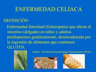 La enfermedad celíaca es una enfermedad autoinmune del intestino delgado causada por la ingesta de gluten en personas genéticamente predispuestas, lo que provoca daño en las vellosidades intestinales. Afecta aproximadamente al 1% de la población pero muchos casos permanecen sin diagnosticar. El único tratamiento es seguir estrictamente una dieta libre de gluten de por vida.