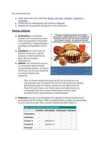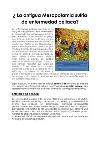 1) La enfermedad celiaca se describe por primera vez en un documento griego del siglo II a. C. y afecta al intestino delgado al no digerir los alimentos. 2) En 1888, el médico Samuel Gee describe con precisión los síntomas de la enfermedad celiaca. 3) La enfermedad celiaca es una intolerancia permanente al gluten que produce daño en la mucosa intestinal y malabsorción de nutrientes.
