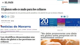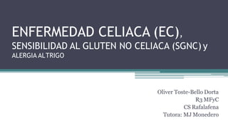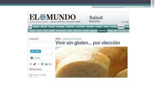 La enfermedad celiaca es una enfermedad autoinmune causada por la ingesta de gluten que afecta la mucosa intestinal. La sensibilidad al gluten no celiaca y la alergia al trigo también pueden ser desencadenadas por el gluten pero tienen mecanismos diferentes. El diagnóstico requiere análisis de sangre, endoscopia y biopsia intestinal. El único tratamiento es seguir una dieta estricta sin gluten de por vida.