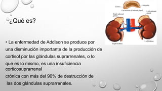 La enfermedad de Addison es una insuficiencia corticosuprarrenal crónica causada por la destrucción de más del 90% de las glándulas suprarrenales, lo que reduce significativamente la producción de cortisol; sus síntomas incluyen cansancio, pérdida de apetito, náuseas, vómitos, presión arterial baja y glucosa en sangre baja, además de darle un color moreno a la piel. El tratamiento consiste en tomar glucocorticoides como la hidrocortisona todos los días en dosis individualiz