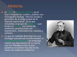 Este documento describe la enfermedad de Addison, nombrada así por Sir Thomas Addison quien la describió en 1855. Afecta a las glándulas suprarrenales que producen cortisol y otras hormonas. Los síntomas incluyen hiperpigmentación, hipoglucemia y astenia debido al déficit de glucocorticoides, e hipotensión por déficit de mineralocorticoides. El diagnóstico se basa en niveles bajos de cortisol y elevados de ACTH, y la detección de anticuerpos contra la corteza suprarren
