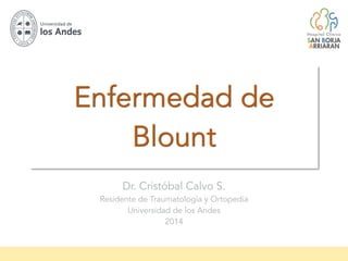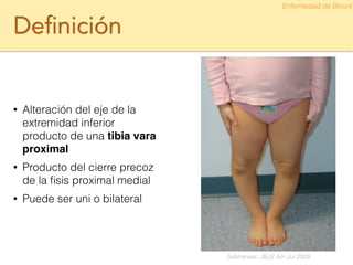 La enfermedad de Blount es un defecto del cartílago de crecimiento proximal de la tibia que causa varo, rotación interna y antecurvatum de la tibia. Existen tres tipos principales - infantil, juvenil y adolescente - siendo el infantil el más frecuente. Hasta el 50% de los casos son bilaterales. El tratamiento depende del tipo, edad y severidad de la deformidad, e incluye opciones ortopédicas y quirúrgicas como osteotomías y epifisiodesis.