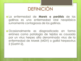 La enfermedad de Marek es una enfermedad viral neoplásica altamente contagiosa de las gallinas causada por el virus de la enfermedad de Marek. Se caracteriza por la presencia de linfomas de células T y la infiltración de nervios y órganos por linfocitos. Los síntomas incluyen depresión, parálisis y muerte. El diagnóstico se realiza mediante estudios histológicos para confirmar la infiltración linfomatosa en los tejidos afectados. La prevención se