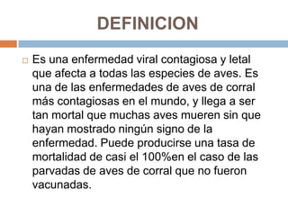 La enfermedad de Newcastle es una enfermedad viral altamente contagiosa que afecta a aves de corral y silvestres. Se transmite fácilmente entre aves y puede causar tasas de mortalidad de hasta el 100%. No tiene tratamiento una vez detectada, por lo que las aves infectadas deben ser sacrificadas para evitar la propagación de la enfermedad.