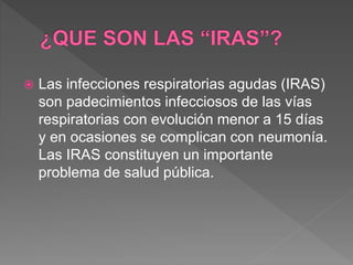 Las infecciones respiratorias agudas (IRAs) constituyen un importante problema de salud pública y pueden complicarse con neumonía. El documento describe tres planes de tratamiento para las IRAs dependiendo de la gravedad de los síntomas: Plan A para IRAs sin neumonía, Plan B para neumonía leve y Plan C para neumonía grave que requiere hospitalización y oxígeno.