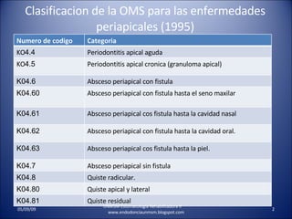 El documento clasifica y describe las diferentes enfermedades periapicales según la Organización Mundial de la Salud, incluyendo la periodontitis apical aguda y crónica, el absceso periapical con y sin fistula, y el quiste radicular. Explica los síntomas y hallazgos de rayos X de cada condición y provee imágenes ilustrativas de las zonas de infección. Concluye que es importante realizar un buen diagnóstico antes de cualquier tratamiento usando pruebas, interrogatorio y razonamiento clínico.