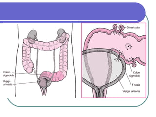 La enfermedad diverticular es una afección común del colon que causa la formación de pequeñas bolsas o sacos en la pared intestinal llamados divertículos. La diverticulosis es la presencia de divertículos y generalmente no causa síntomas, mientras que la diverticulitis ocurre cuando los divertículos se inflaman y puede causar dolor abdominal, fiebre y otros síntomas. El tratamiento de la diverticulitis depende de la gravedad de los síntomas y puede incluir antibióticos, dieta blanda y cirugía en casos graves.