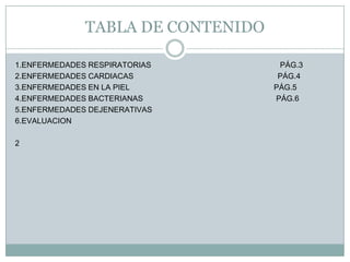 Este documento presenta una tabla de contenido sobre varios tipos de enfermedades, incluyendo enfermedades respiratorias, cardíacas, de la piel, bacterianas y degenerativas. Cada sección se detalla en una página diferente, con una sección final para la evaluación.