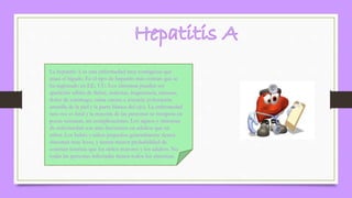 El documento describe tres enfermedades causadas por falta de higiene: la hepatitis A, que ataca el hígado y causa síntomas como fiebre y dolor de estómago; la influenza, que es una enfermedad aguda de las vías respiratorias que puede presentarse en pandemias o epidemias; y la gingivitis, una inflamación e infección de las encías causada por bacterias que se puede prevenir mediante el cepillado diario de dientes y uso de hilo dental.