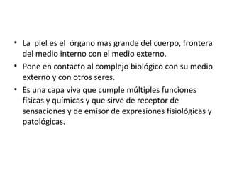 La piel cumple múltiples funciones como protección, termorregulación y sensación. Está compuesta de epidermis y dermis. Presenta diversas lesiones como máculas, pápulas, nódulos, vesículas, ampollas, pústulas y escamas. Las enfermedades de la piel incluyen dermatitis, urticaria, cáncer de piel, quemaduras y herpes zoster. El herpes zoster se caracteriza por una erupción dolorosa siguiendo el trayecto de un nervio.