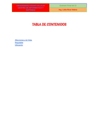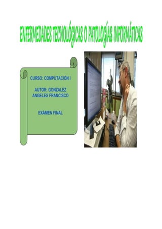Este documento habla sobre las enfermedades y afecciones que pueden surgir por el uso prolongado de computadoras y dispositivos tecnológicos. Describe algunas condiciones como molestias cervicales, tendinitis y síndrome del túnel carpiano que pueden ser causadas por el trabajo constante frente a una pantalla. También cubre recomendaciones para prevenir problemas de visión como descansar los ojos regularmente, usar un monitor a la altura y distancia adecuadas, y ajustar el brillo. Finalmente, da pautas ergonómic